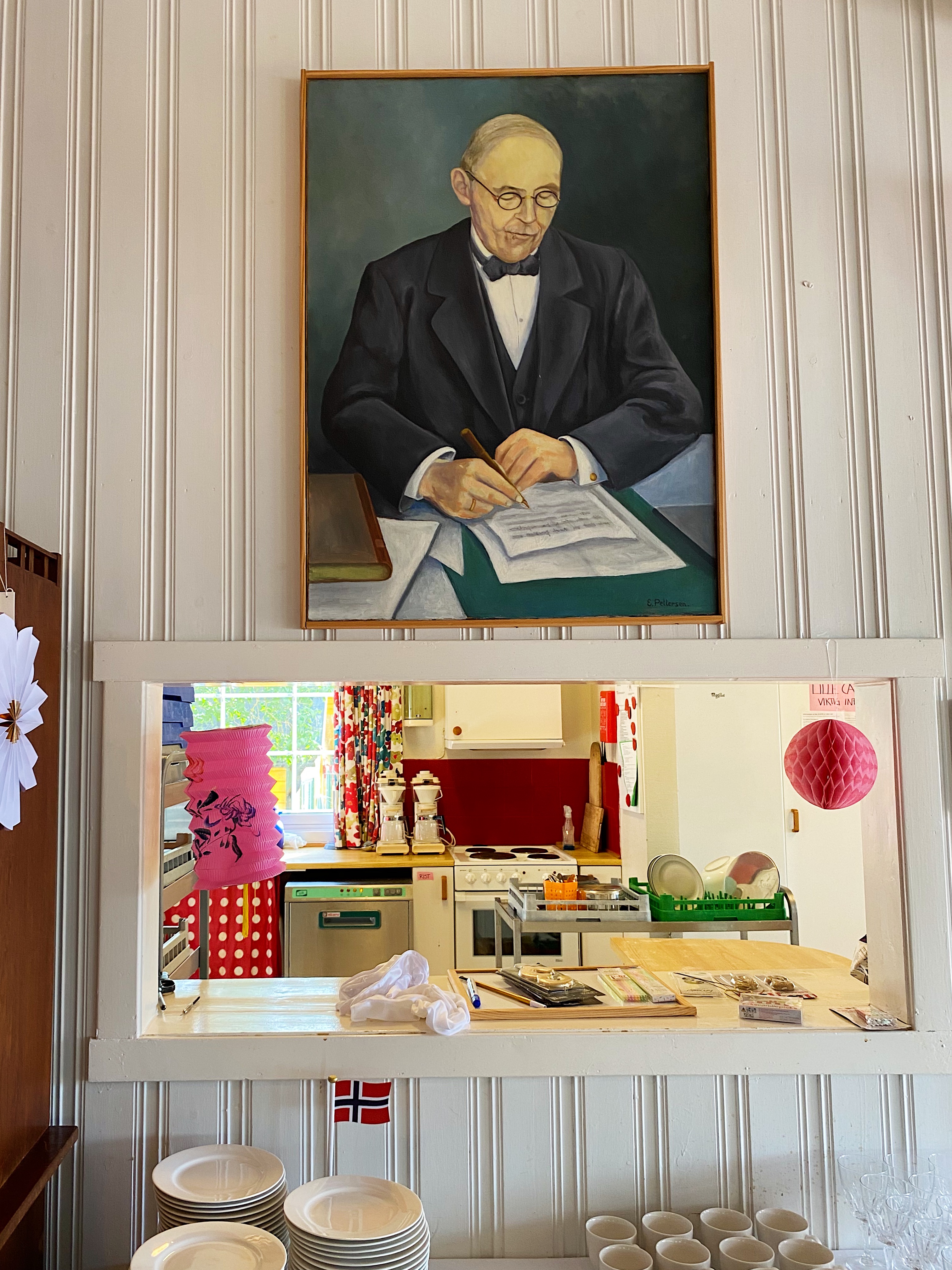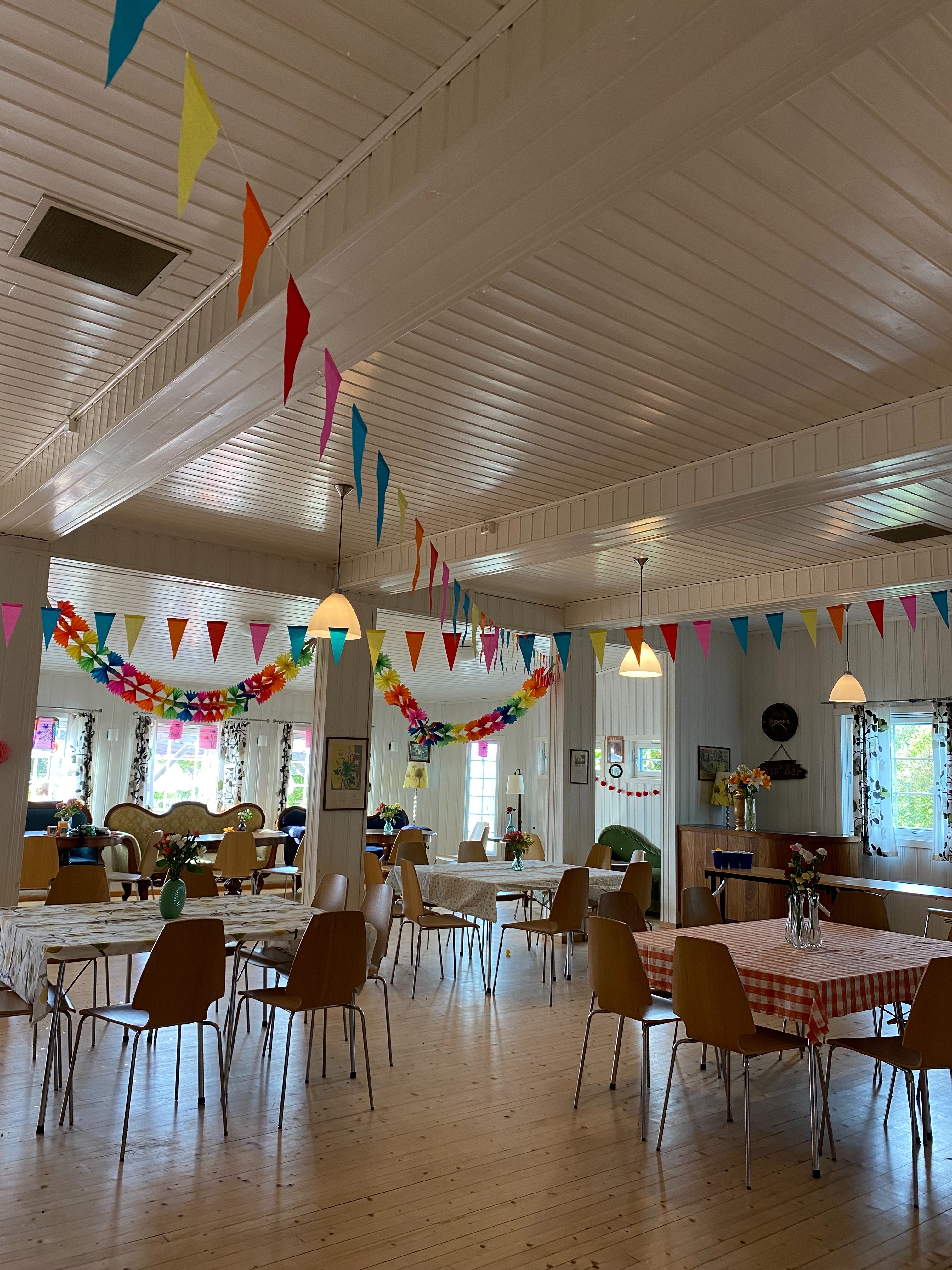 a Kolonihager is a small community of portions of land with small sheds on them. People who live in appartments usually own these and go after work to look after their garden, have some drinks or a barbecue. The little sheds are more like cottages and an ode to traditional Norwegian architecture and design. I visited Hjemmets Kolonihager . In the centre of this Kolonihager there is a small community hall. I stuck my head in and there was some people organising a party with the cutest decor.